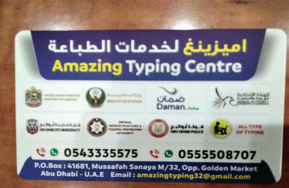 Amazing Typing centre is strategically established and located in Musaffah, Abu Dhabi, United Arab Emirates. Typing centers in UAE well-equipped to offer basic typing training to the interested individuals looking for secretarial job in offices. Basic typing skill is often required for all types of text or word processing based jobs therefore typing centers are essentially producing skilled typists at reasonable rates.