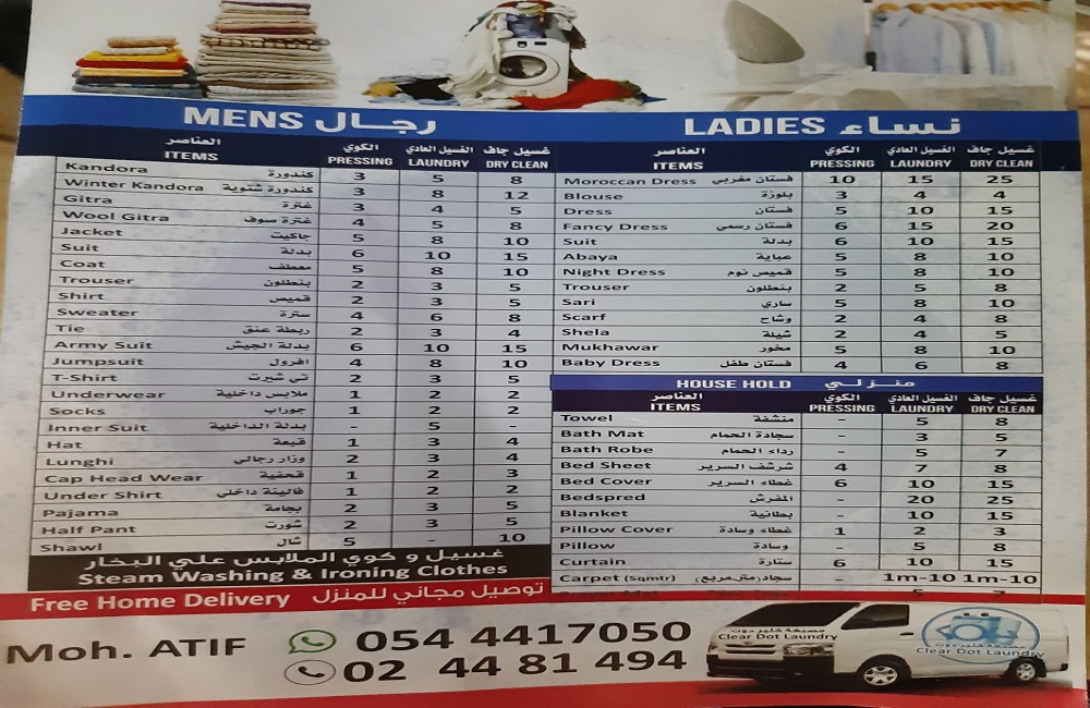 Clear Dot Laundry located in 4 Al Yad'ah St - Mohamed Bin Zayed City - Mussafah Community – Abu Dhabi – U.A.E. Our services provide an affordable and convenient way of getting your wash, laundry, and dry-cleaning. The processing of washing, laundry, and dry cleaning is done in best-class setups with Italian equipment. We also do laundry with antiseptic wash, fabric softener, and hygienic detergents. Clear Dot Laundry is 1 in Dry cleaning, Rolling, Polishing, Steam Press, 100% pure petrol wash, Stain removal services. We are specialized in the removal of stains of all natures without damaging the fabric.