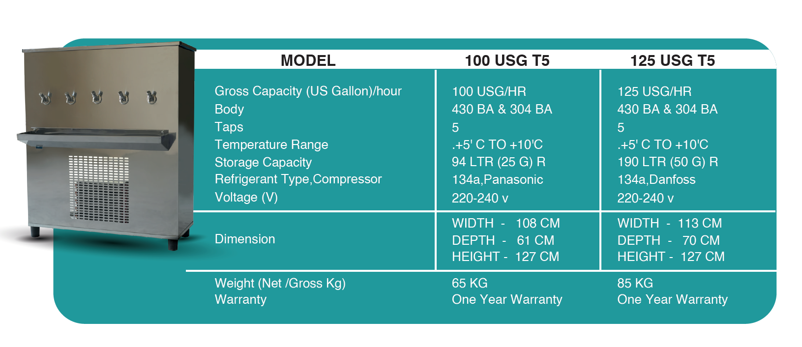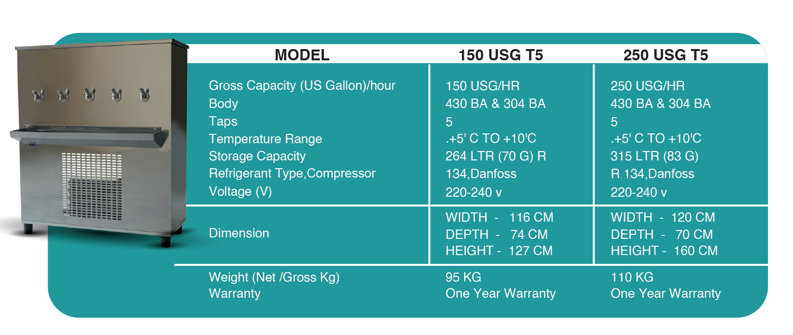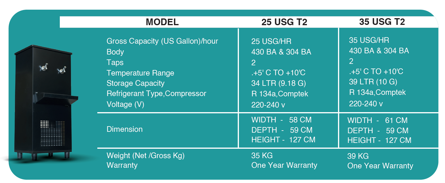 "Our Stainless steel body drinking water Coolers come in Cooling Capacities ranging from 25 USG - 250 USG and with Push Button Taps (2 taps – 5 Taps). All Our Drinking Water Coolers are supplied with a Standard single-stage candle water Filter. We have an exceptional reputation for customer support and model availability with premium features. With over 13 years of experience designing equipment exclusively for standard and customized systems, we ensure the highest quality standards for the global market. Delivery schedules are promptly executed to meet market deadlines and International Standards. Our water coolers are used in Worker Accommodations, Labor Camps, Mosques, Schools, Restaurants."