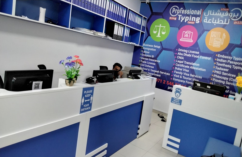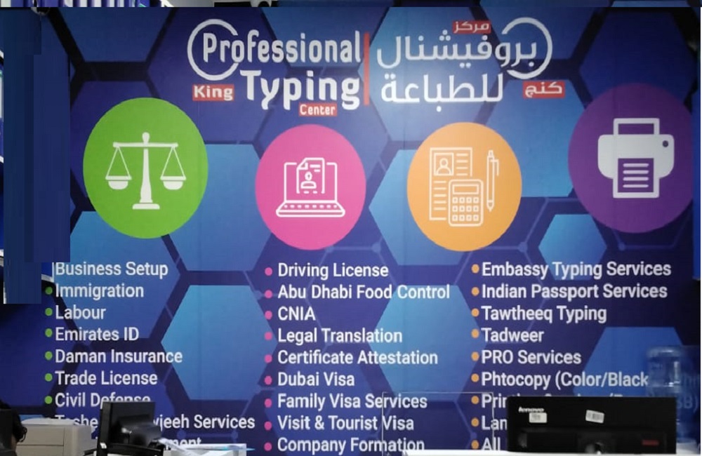 Professional King Typing Center is strategically established and located in Musaffah, Abu Dhabi, United Arab Emirates. Typing centers in UAE well-equipped to offer basic typing training to the interested individuals looking for secretarial job in offices. Basic typing skill is often required for all types of text or word processing based jobs therefore typing centers are essentially producing skilled typists at reasonable rates.